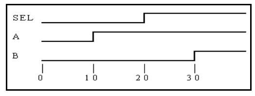 초기에 모든 신호는 0으로 초기화 되었고 10ns단위로 A, SEL, B 신호가 1로 값이 바뀌었다.